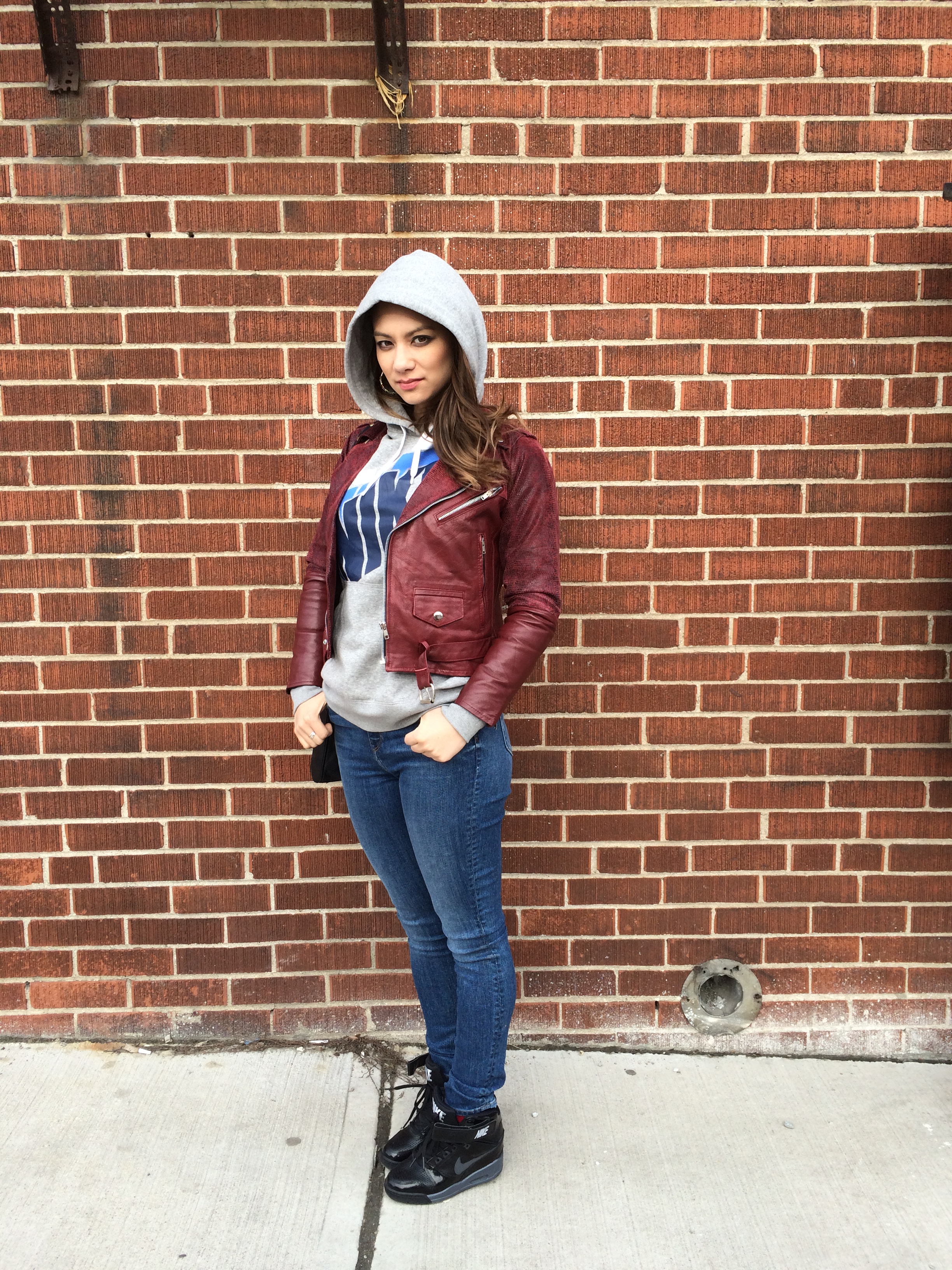 IMG_8631I have been swamped lately and apologise for not posting more so i wanted to do a quick outfit post! As you probably can tell i love Nike!! Anything Nike!!! Here i am rocking my Nike revolution sky wedges, Nike Pullover hoodie, Aritzia Paradise Mine high waist jeans and my fav moto right now from Supercolour vintage.