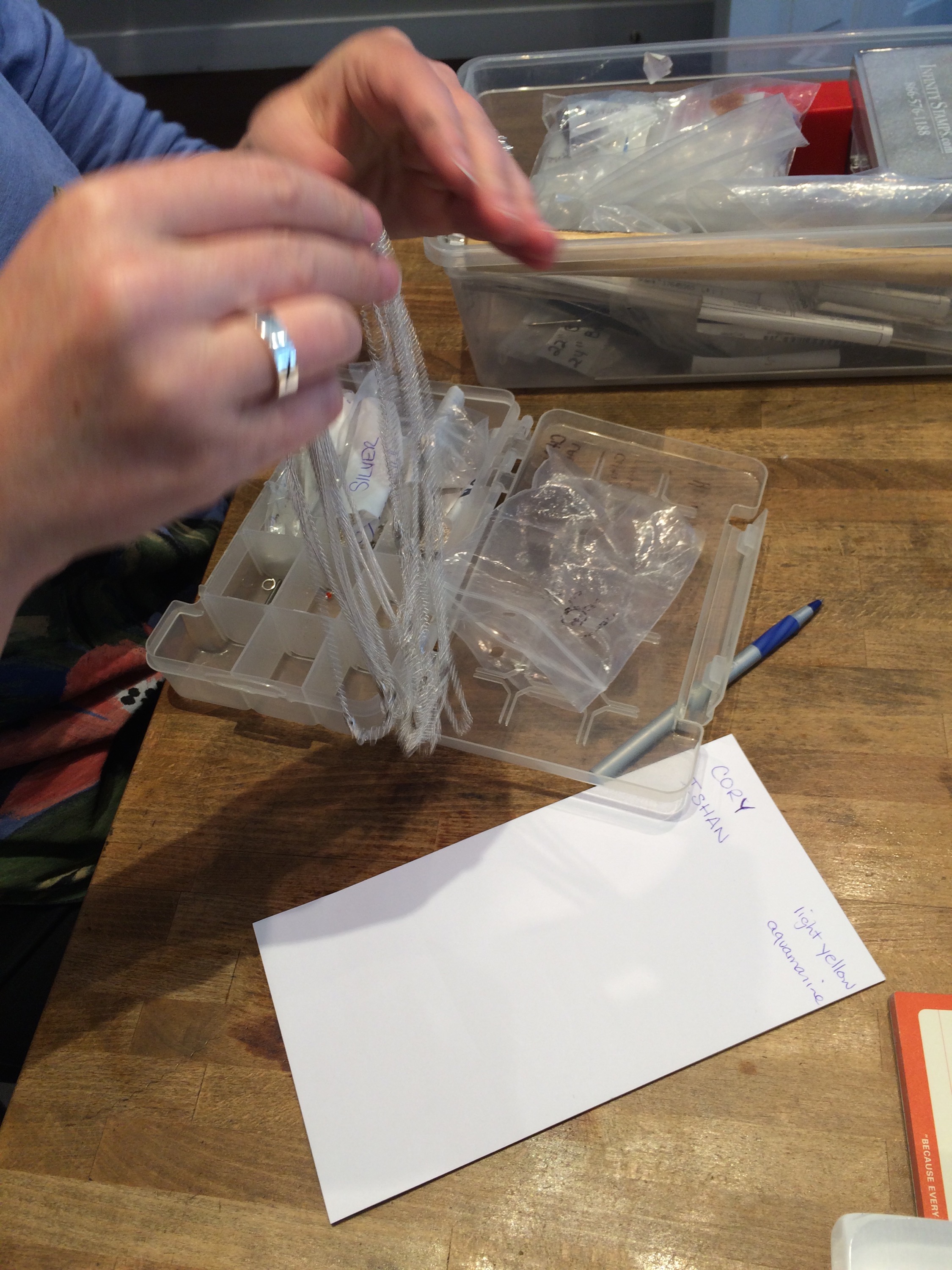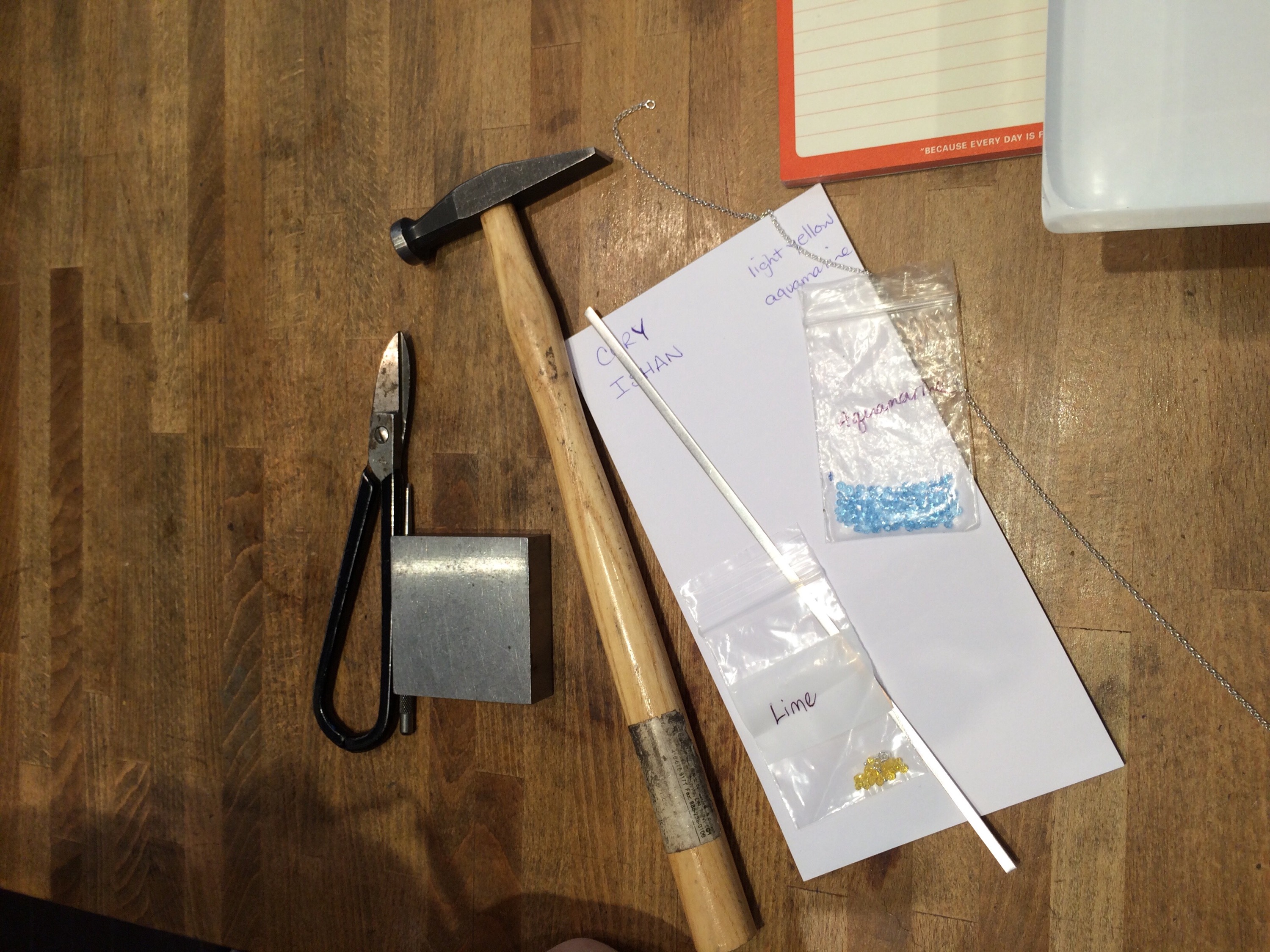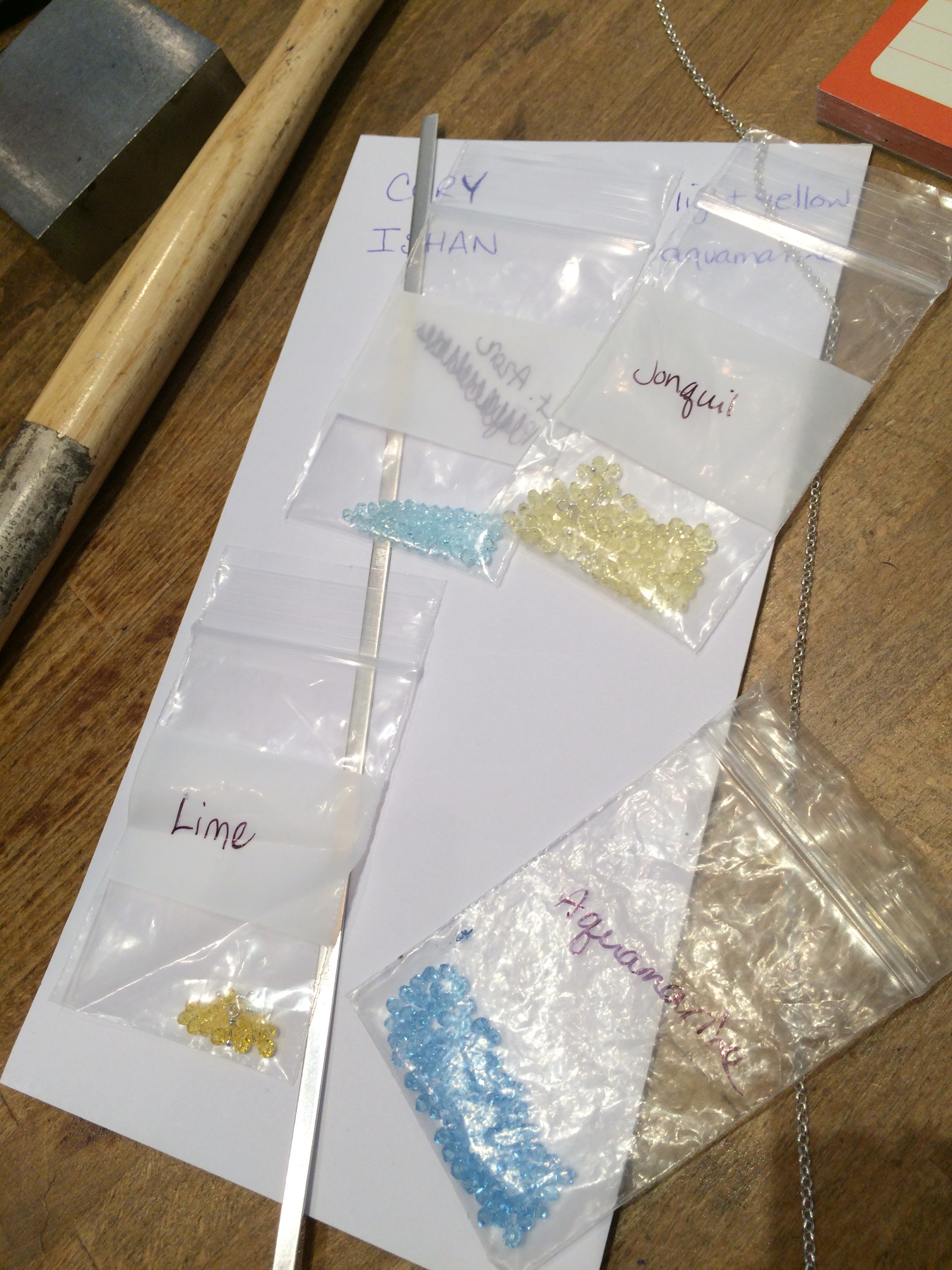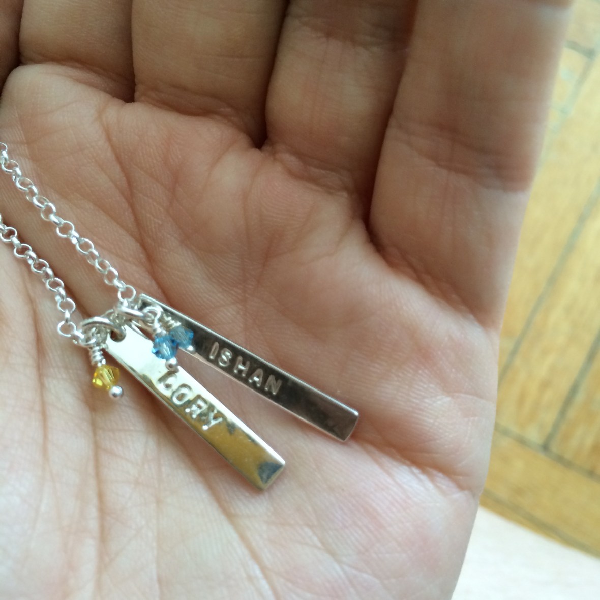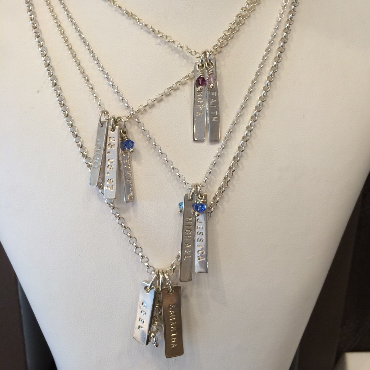 Last but not least she added the crystals and name plates to the silver chain!