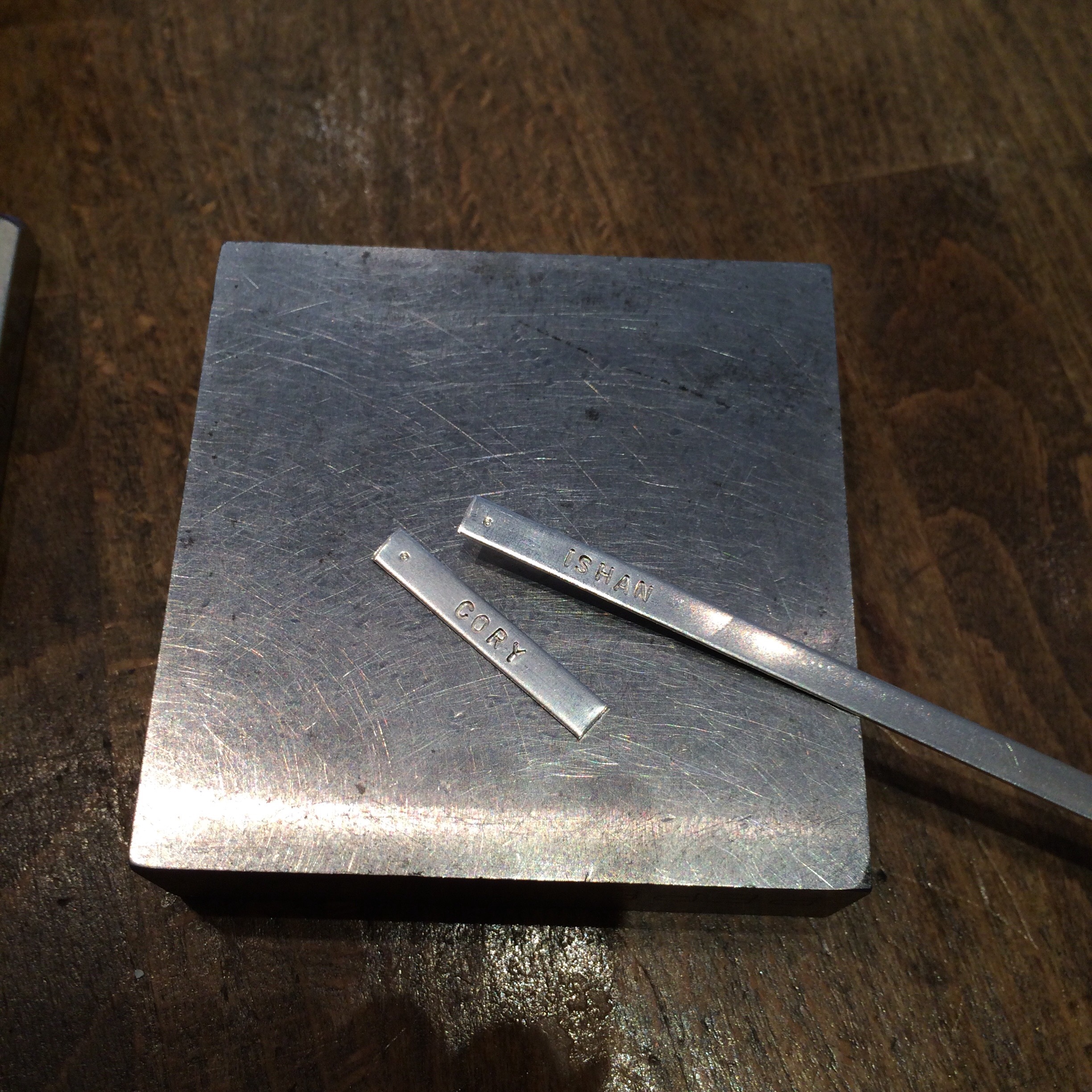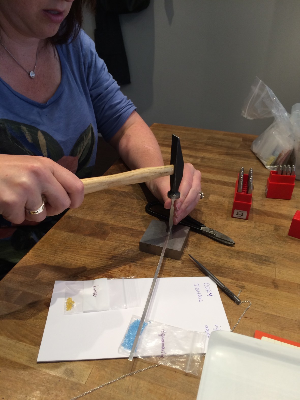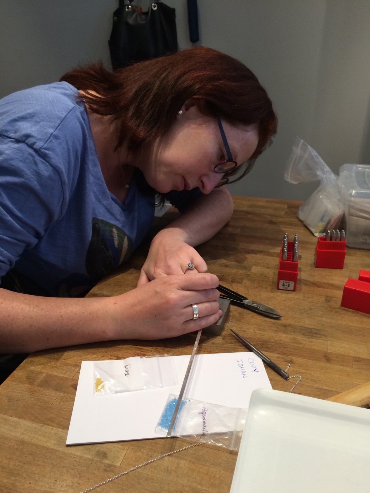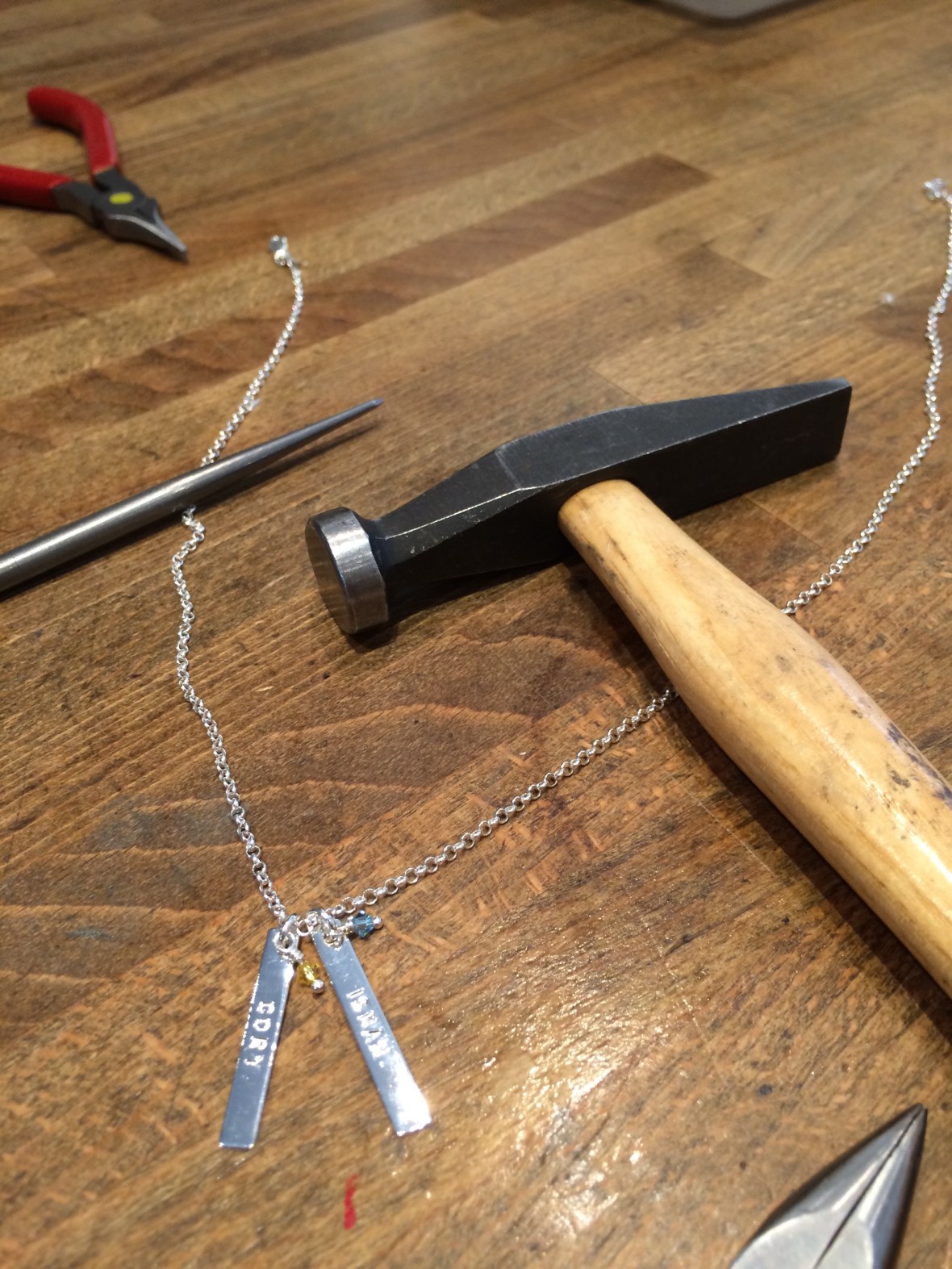 I went with my fiancée and I’s birthstone colours. Then she started hand stamping out our names!
