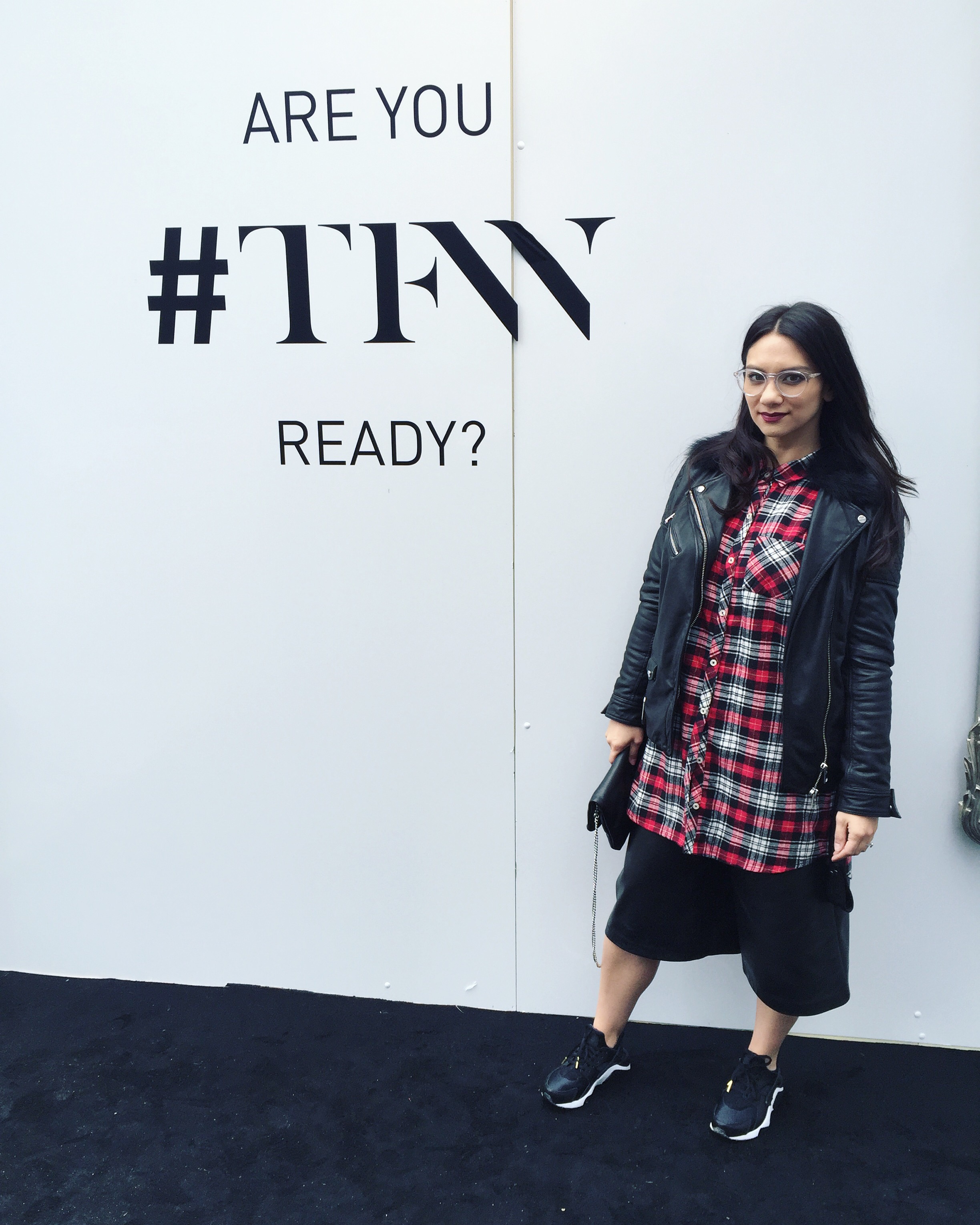 I wore Canadian designer LaMarque Culottes and Biker Jacket. Forever21 Plaid top and Limited edition Superbowl NFL Nike Huaraches. Clearly.ca glasses.